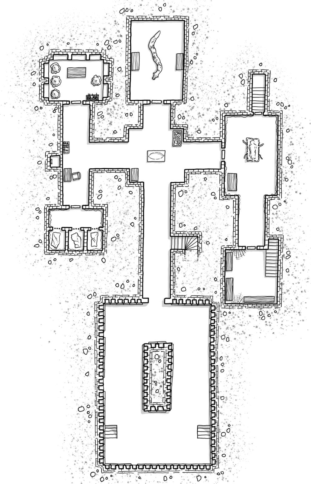 The hooks, such as they are, will eventually point the party to the festival and in particular the more exclusive party that is happening above the crypts. This part is fine, as the party can wander around the festival, meet some folk, and get some scenes that present the lore of the setting in organic ways. The party in the lodge above the crypts has a great table of 20 guests they could interact with, and in the course of said interaction these npcs will drop some secrets about the crypts. These secrets are…quite on the nose. There is, for example, one in which an npc says