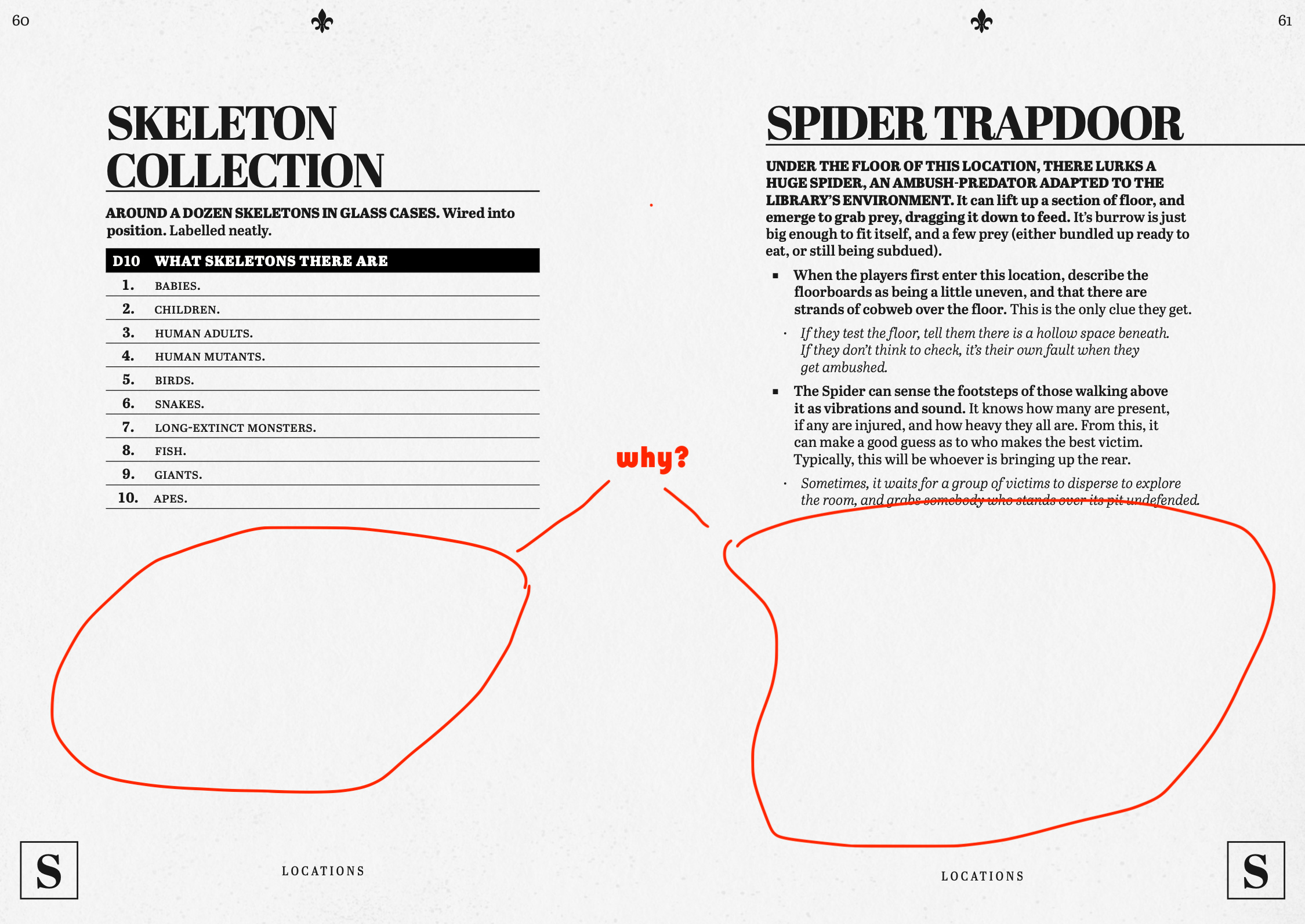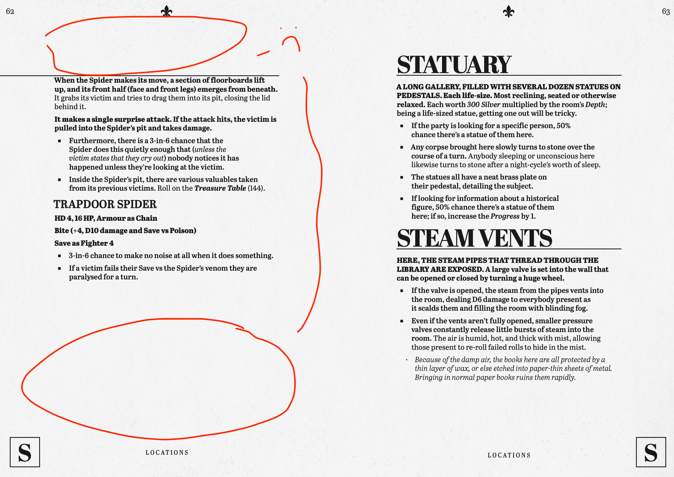 Finally, the most perplexing for me is The Stygian Library Remastered. First of all, Emmy Allen’s The Stygian Library is an innovative, wonderful product. It’s full of creativity and treats the GM as a player, there to be surprised as well. But it presents particular problems for information design, because the whole dungeon (a “depthcrawl”) is generated live during play. For this reason, probably the best “version” of the Stygian Library is an online generator made by a fan. Unfortunately the remastered version is just a very nice reproduction of the original with some (great) added art, but is not a product that is more usable than the original.