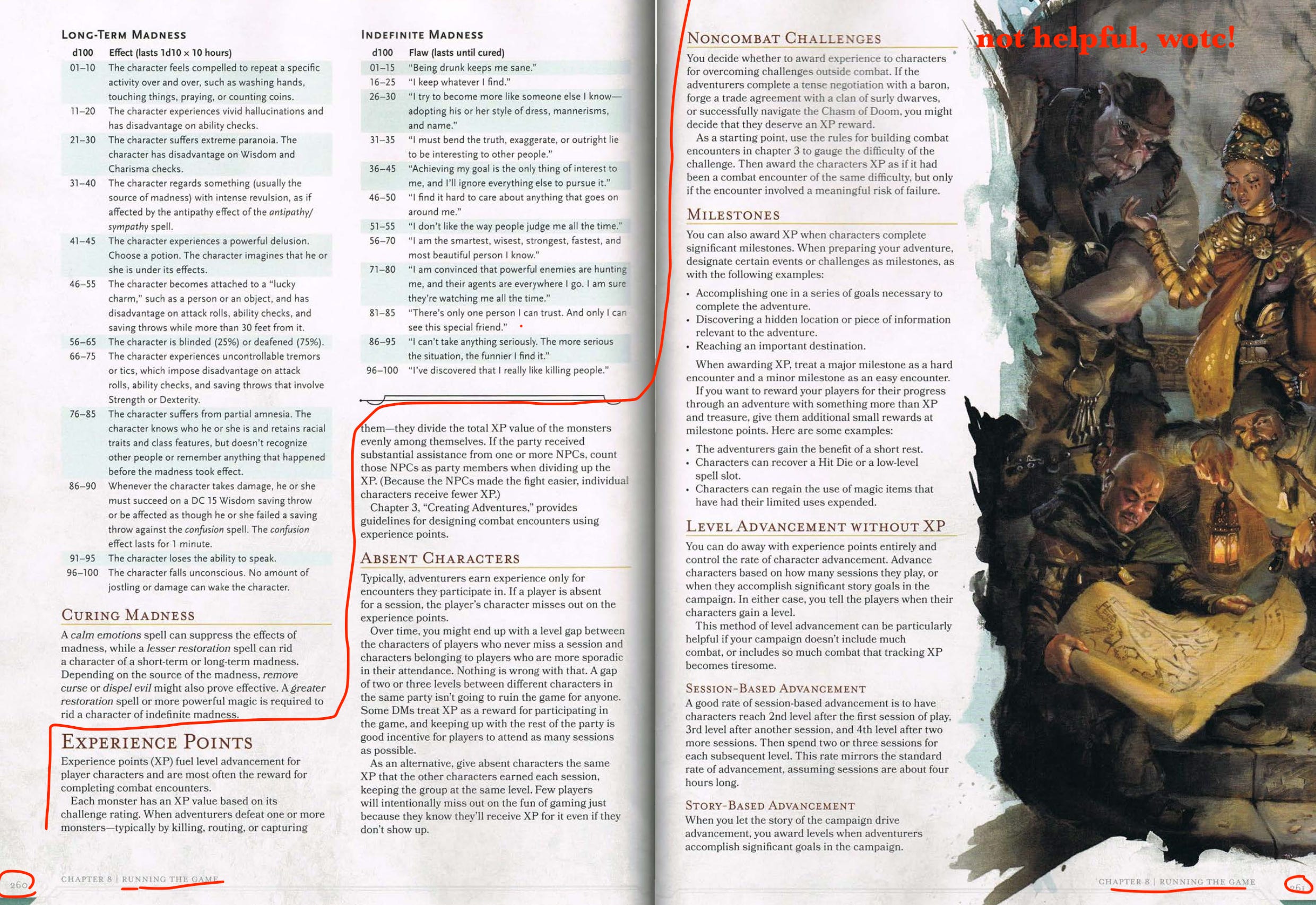 The A4 trad games seem to not prize layout and graphic design as much. Chief offender here for my is the 5e dmg, which has poor information design overall. The chapters are in the wrong order, and within each chapter important information is often juxtaposed with rules your table my never use. For example, what should be a very important section for a dungeon master—awarding experience—is confusedly mixed on the page with the second page of “madness” rules. It conveys to the new DM that awarding experience is of the same level of importance as the random table for long term “madness” (we call it madness because it’s still the 19th century, apparently). The experience rules themselves are too short to be useful and yet at the same time vague and noncommittal in what they do say. The whole book is like this.