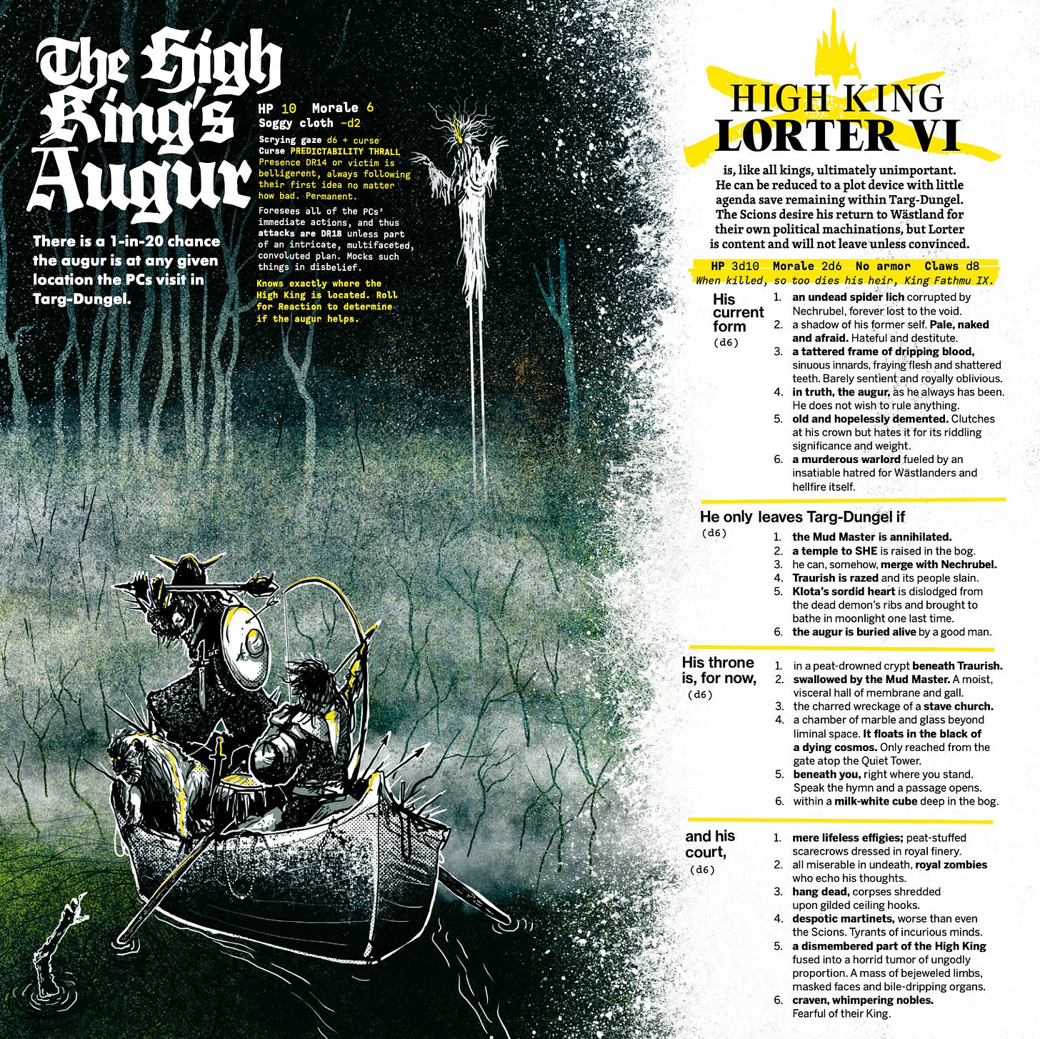 So it’s as a fan as I come at the layout of Putrescence Regent, a kickstarter that I backed (like all the other MB kickstarters). Overall I love the idea of the project, and the music is great; I can’t wait to play a MB game where I can play it to set the mood. However, when it comes to the actual rpg content, despite the high production value, I am a little disappointed. The sleeve contains a map, random encounters, and some other tables, while the insert mostly details one town, three factions, one dungeon, and the bbeg. I was instead expecting a regional point crawl, thinking that the booklet would detail a handful of dungeons, maybe six. I would say this is a missed opportunity. The 12x12 format is huge compared to the A5 norm that many OSR products adhere to, and yet it feels like they don’t do a lot more with the extra space. The minimalism of many OSR games are what allow them to be flexible but also add to their usability at the table, and I’d argue this is even the case for the Mork Borg core book (where the rules all fit on one page that is included in the endpapers).