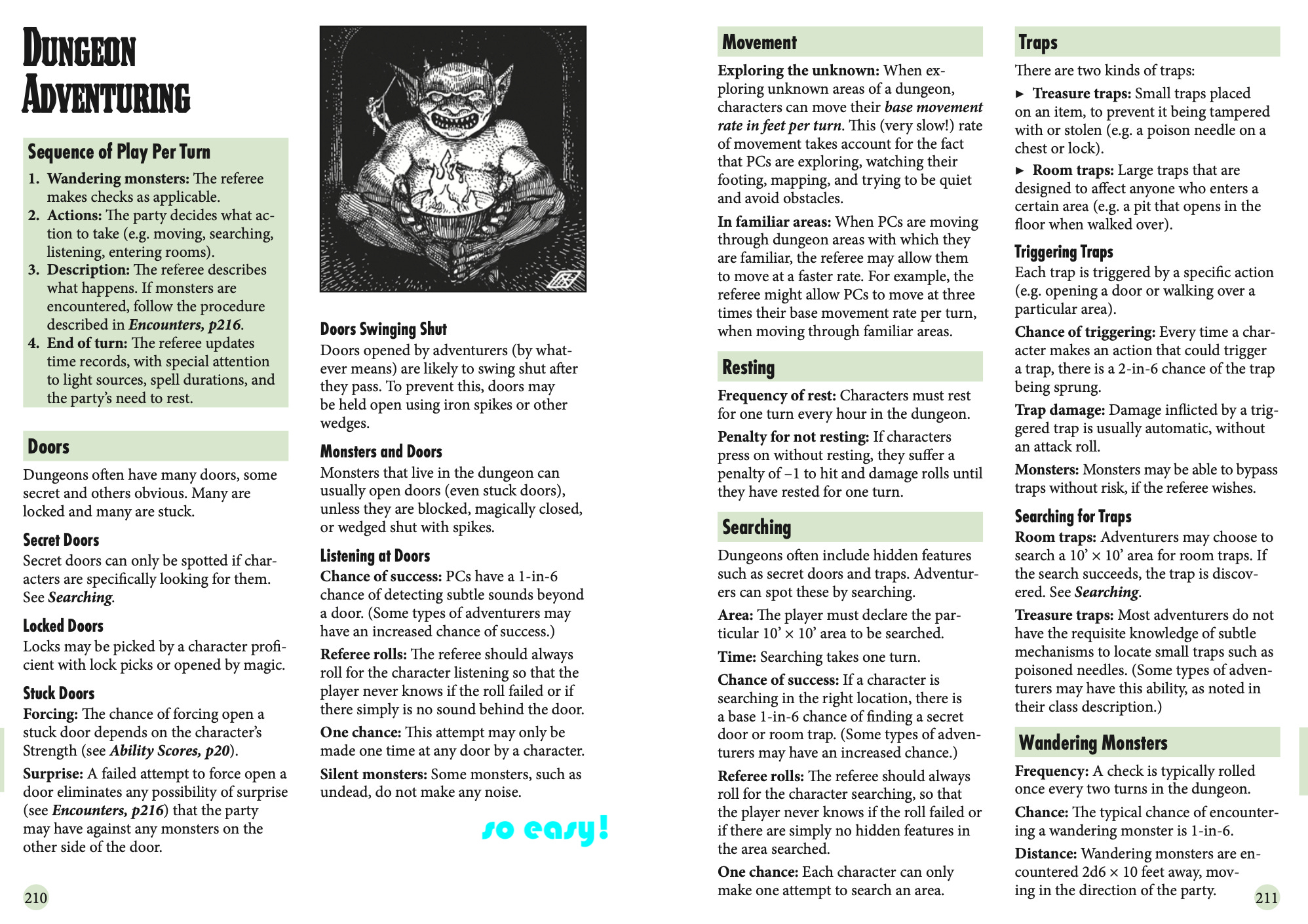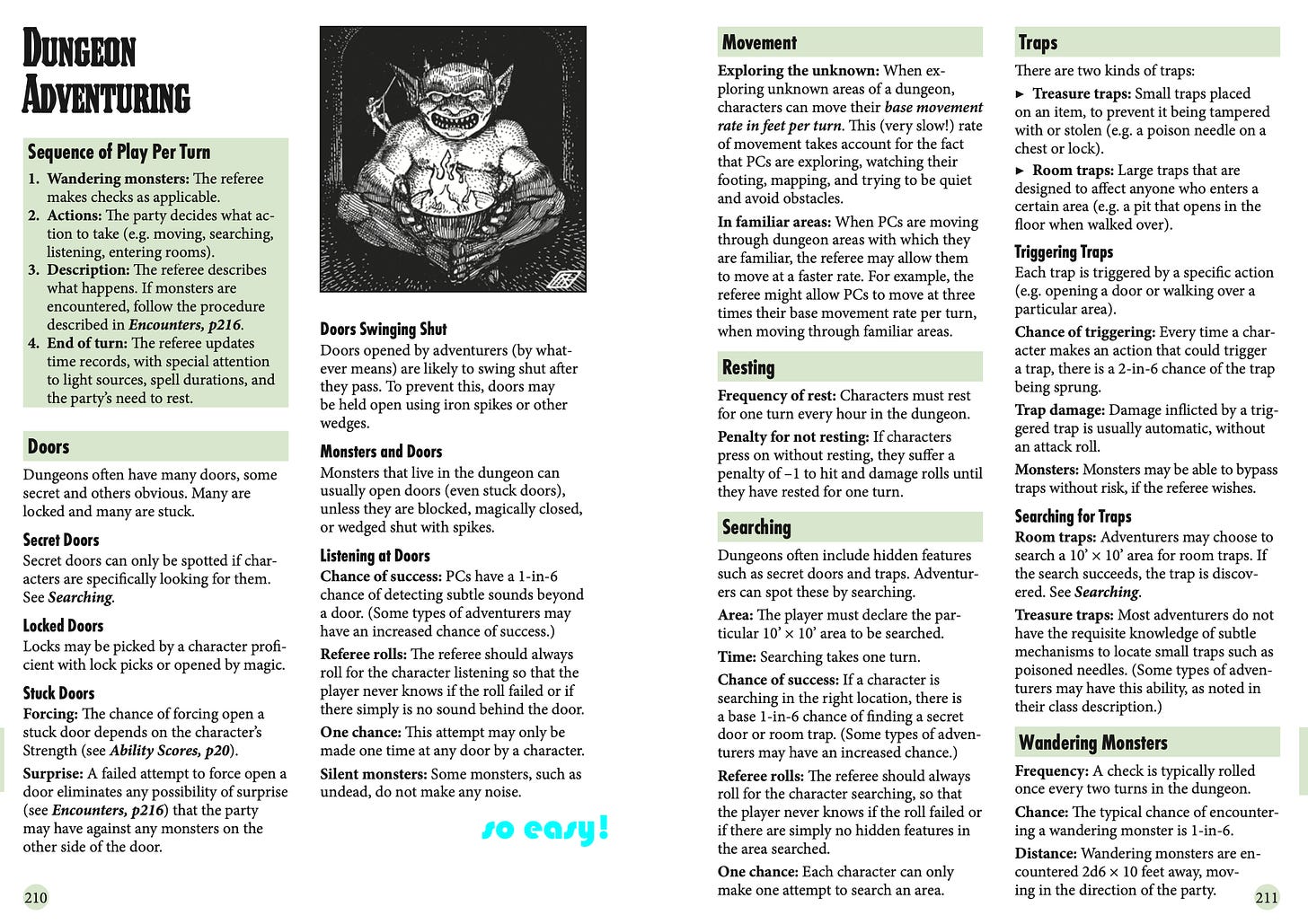 Old School Essentials is obviously the standard bearer in communicating ideas effectively across a two page spread. While some say it lacks the charm of the original, it more than makes up for it in efficient, “control panel” two page spreads. While the rules of b/x demand some awkwardness (e.g. in monster stat blocks that are cluttered if still much better than 5e), overall it’s all handled really well and is easy to read