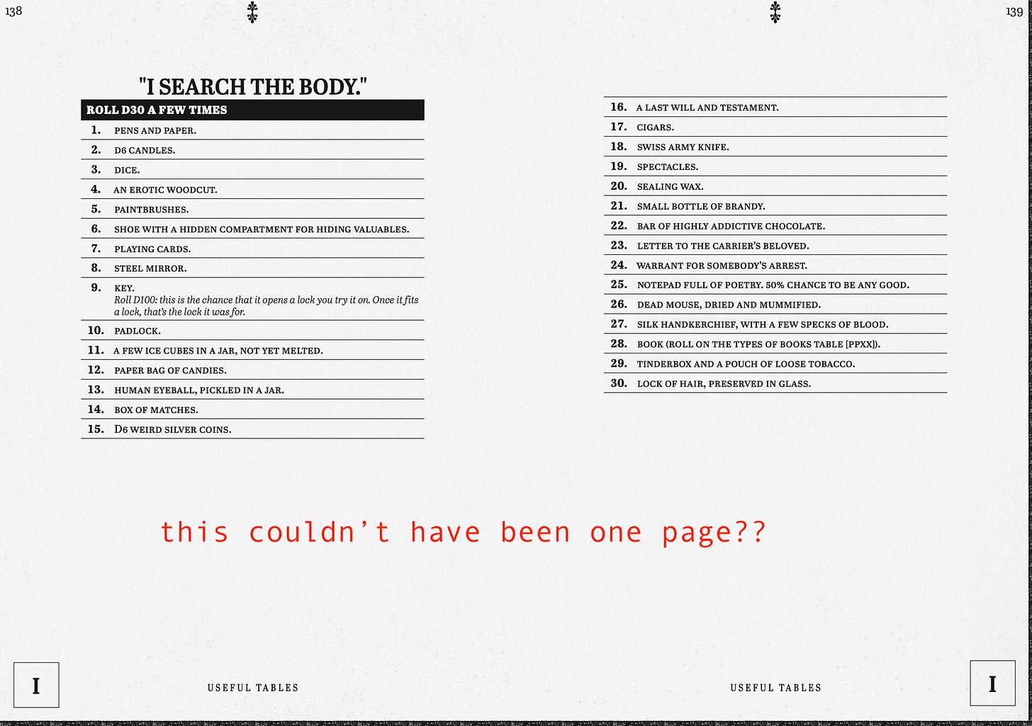 Perplexingly, they did not make use of the endpapers to include any of the necessary tables that the GM will have to consult regularly during play, even though there are several (6) pages at the end of the book that are included but only contain the generic endpaper art. Meanwhile, they organized the interior with large margins and large title fonts, with the result that they could only present so much information per page. The result is a page that contains a discrete unit of information and a lot of unnecessary white space, and is no more satisfying than an overly full a4 trad page. Tables that could have helpfully been fit on one page are spread over two, and even though it’s an a5 book, with the margins the actual content of the page feels more like a pocket-sized book.